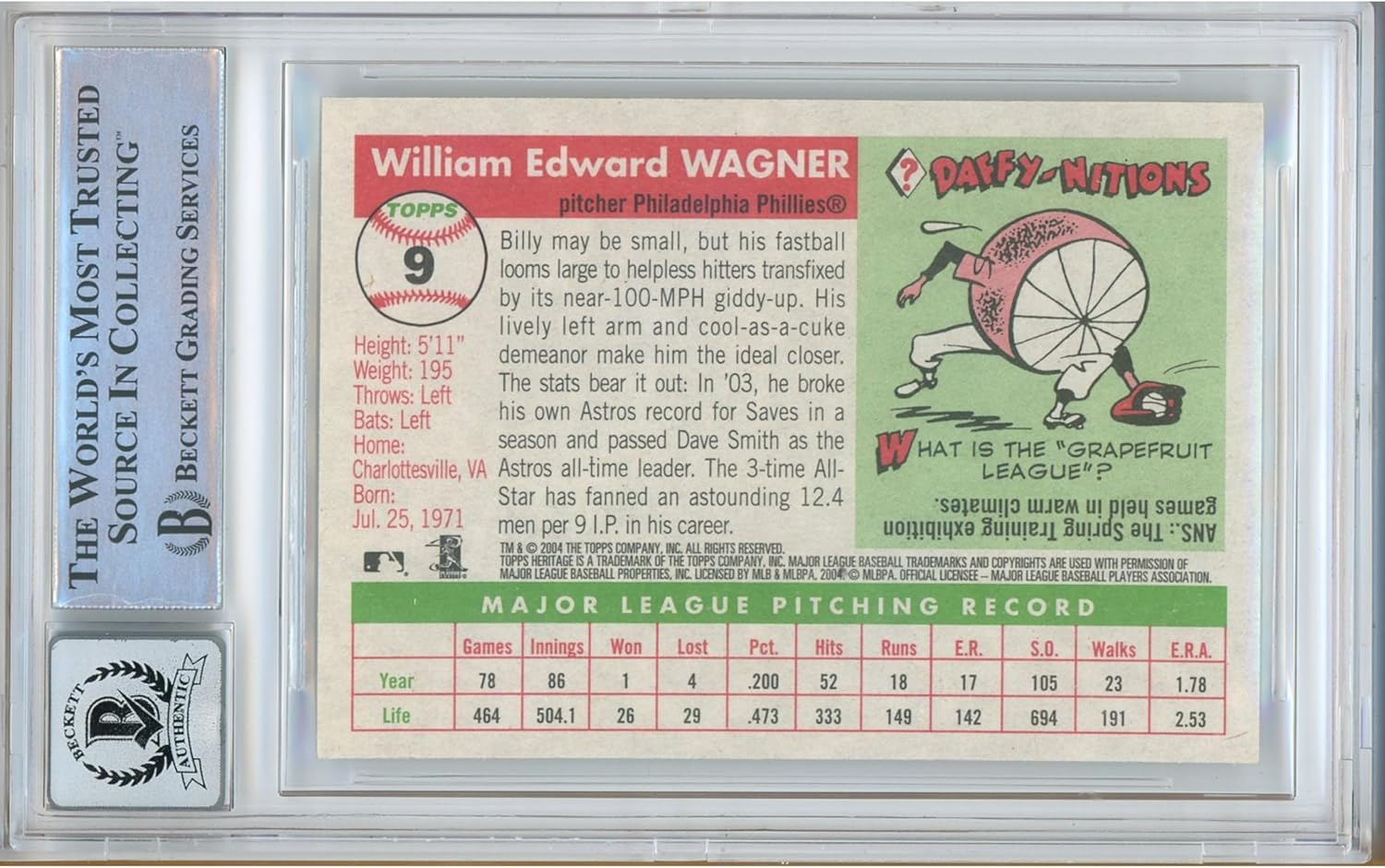 Upgrade your Philadelphia Phillies collection with this Billy Wagner Signed and Autographed 2004 Topps Heritage baseball trading card. This Trading Card Slabbed presentation is built for long-term protection and clean display, making it a strong choice for Topps Heritage set builders, MLB autograph card collectors, and Phillies fans. This card is Beckett authenticated and sealed in a graded holder showing a BGS Auto 10 autograph grade on the label, highlighting premium signature presentation in a tamper-evident slab. authentication number shown in photos and verifiable in the Beckett database. Whether you collect elite closers, build a Phillies bullpen display, or want a high-trust baseball gift, this encapsulated autograph card delivers verified authenticity and a display-ready format collectors value.