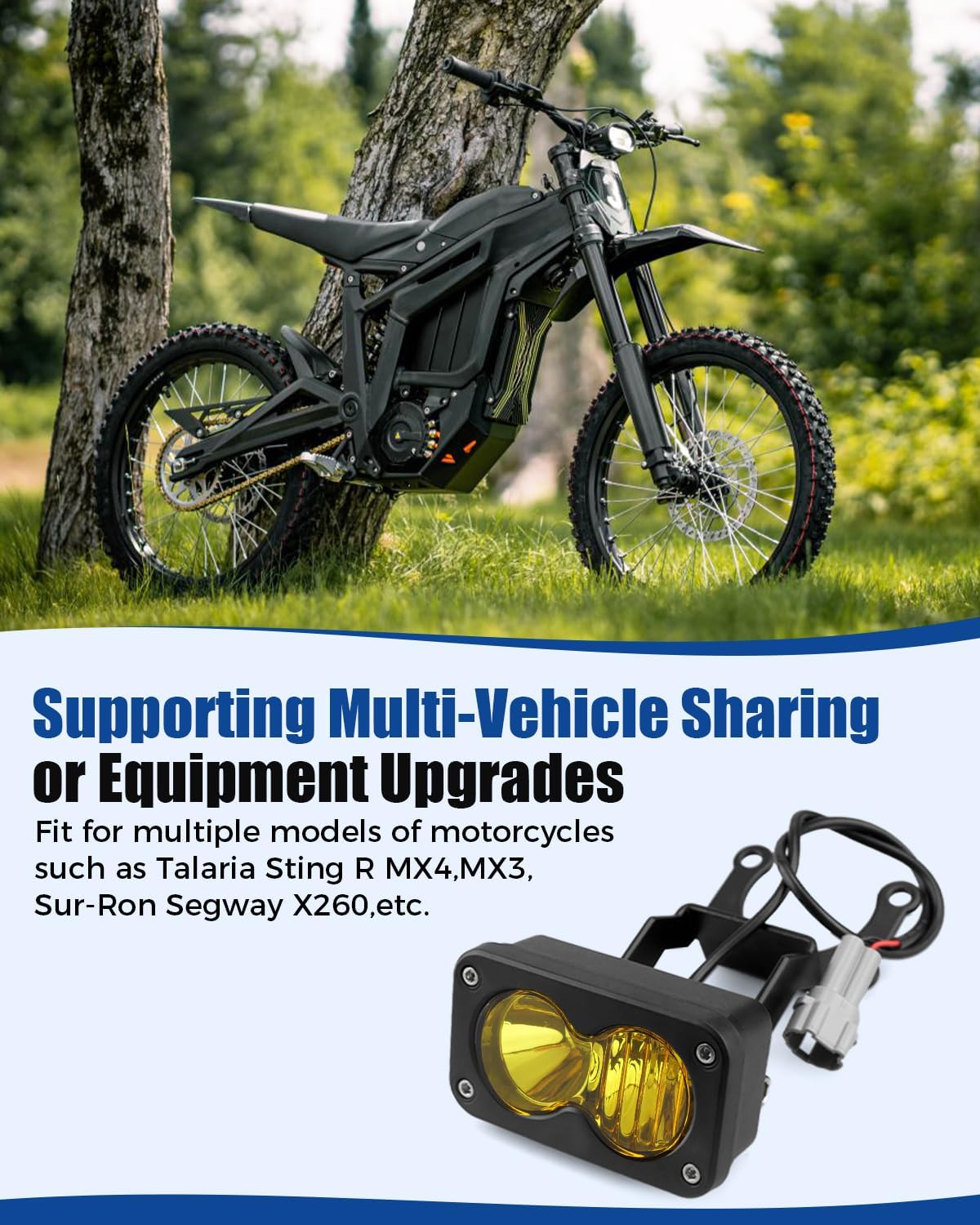 Fitment: Fit for Talaria Sting R Fit for Talaria Sting MX4 Fit for Talaria Sting MX3 Fit for Sur-Ron Segway X260 Specification: Voltage: 12V Color: Yellow Waterproof Rating: IP67 Color Temperature: 6000-6500K Package Contents: 1*Light, 1*Frame, 1*Adapter cable, 6*Screws, 6*Nuts, 2*Washers, 1*Hex wrench