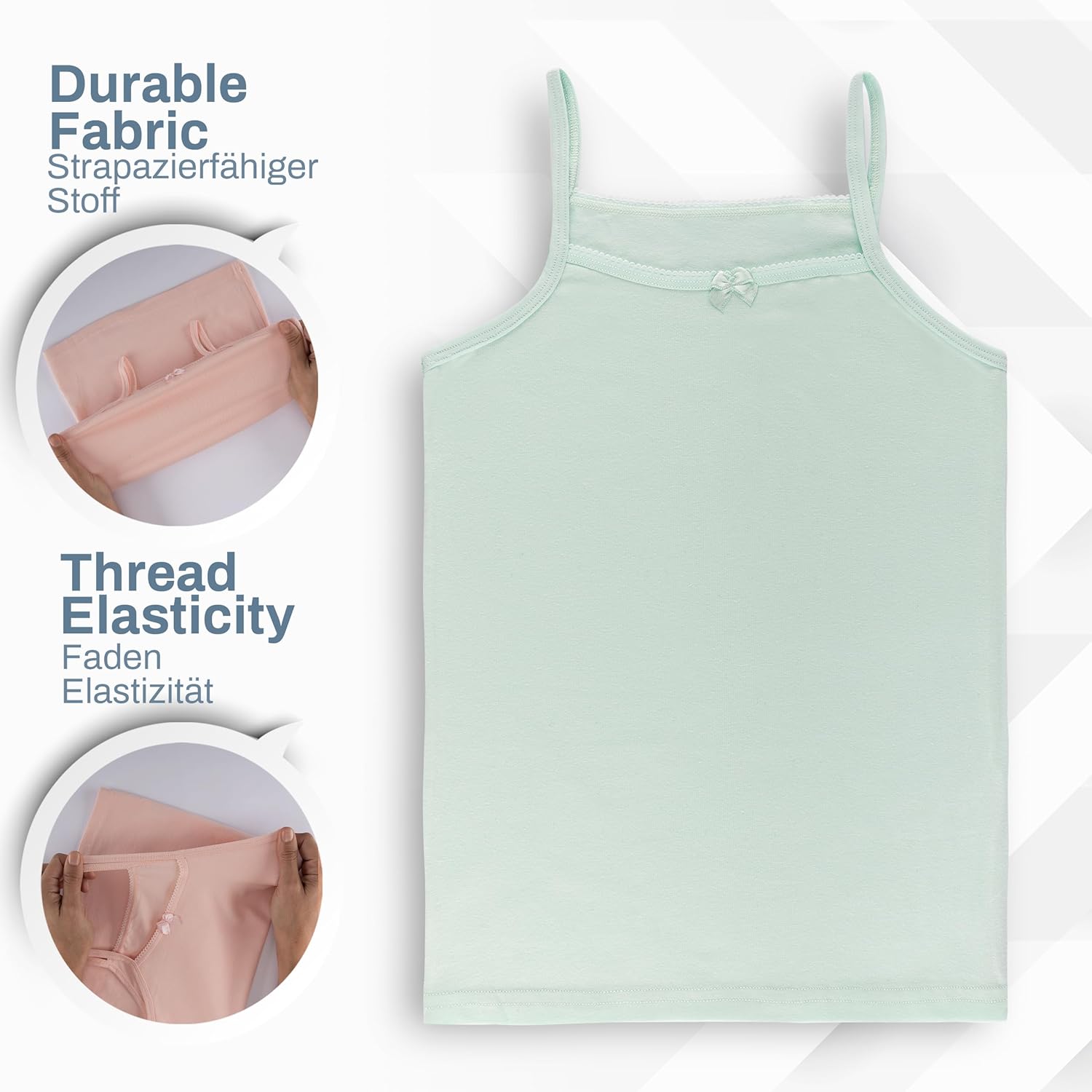 6 girls cotton undershirts – spaghetti straps LOREZA Girls cotton undershirts with spaghetti straps. Comfortable fit and breathable fabric. Soft cotton with good elasticity. Includes a subtle decorative bow. Durable and high quality. Washable at 30 degrees Celsius. Comes in 6 assorted colors. Material: 95 percent cotton, 5 percent elastane