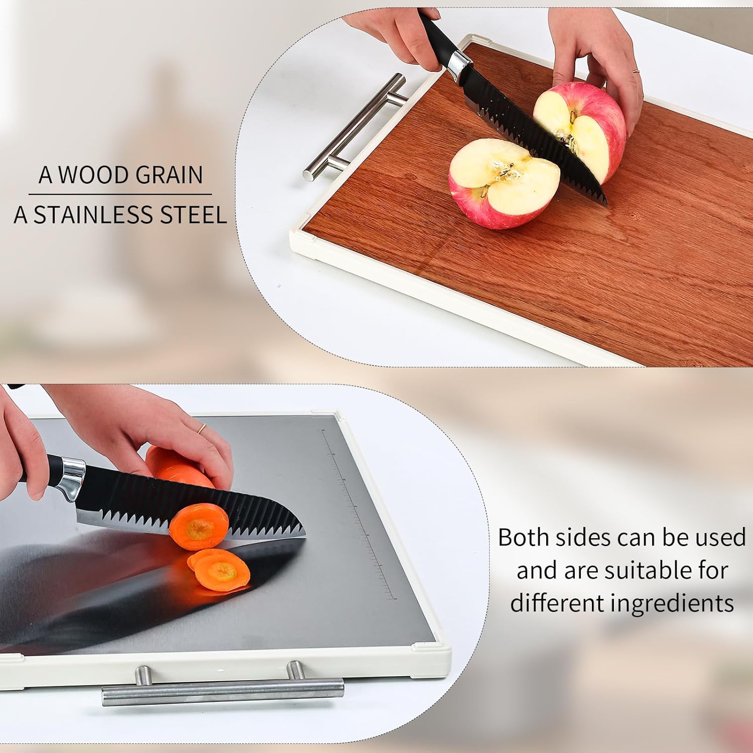 Why Choose This Cutting Board?This double-sided stainless cutting board is simple, strong, and easy to use. The stainless steel side is perfect for cutting meats, and the wood side is gentle on knives. It’s easy to clean, saves space, and looks great in any kitchen. With this cutting board, you can prepare meals safely and efficiently, keeping your kitchen organized and clean.Two Sides for Different Foods: One side for meats and fish (stainless steel) and the other for fruits and vegetables (wood).Durable & Long-Lasting: The stainless steel side is resistant to stains and odors, and the wood side protects your knives edges.Easy to Clean: Wipe the stainless steel side clean, and the wood side is treated to resist moisture and stains.Knife-Friendly: The wooden surface keeps knives sharp, while the stainless steel side offers a sturdy cutting surface.Hygienic Design: Use each side for different food types to avoid mixing raw foods with ready-to-eat foods.Space-Saving: The slim design is easy to store in a drawer or hang up when not in use.Eco-Friendly: Made with sustainable materials for a long-lasting and good for the environment.Stylish & Practical: Elegant wood finish and sleek stainless steel add a modern touch to your kitchen while being practical for everyday use.